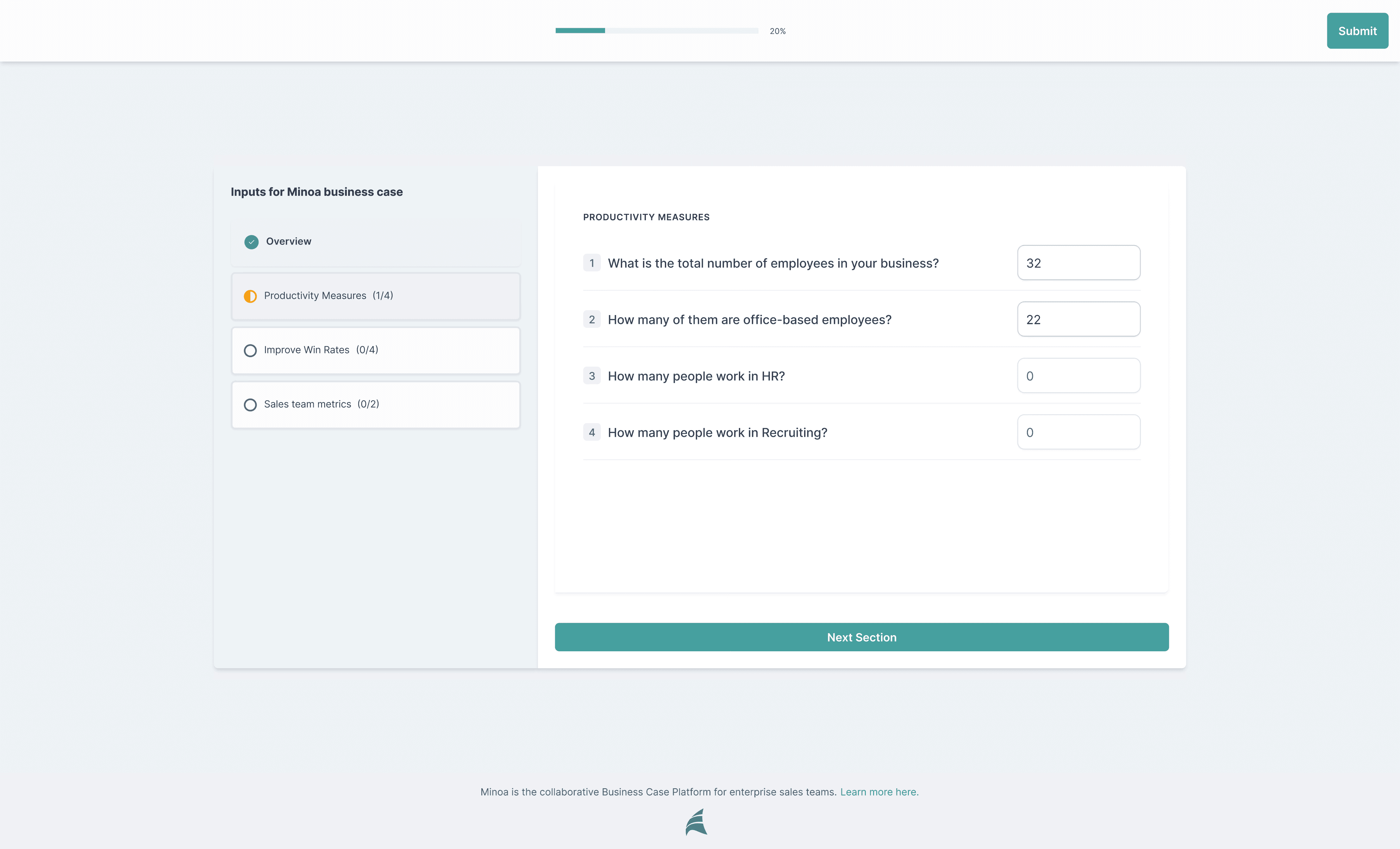 A key friction point in Minoa's workflow was data collection. To build compelling ROI models, sellers needed real business metrics from prospects: current costs, team sizes, time spent on processes. This was happening through spreadsheet requests sent over email, which created delays, felt insecure for sensitive data, and required manual data transfer back into Minoa.