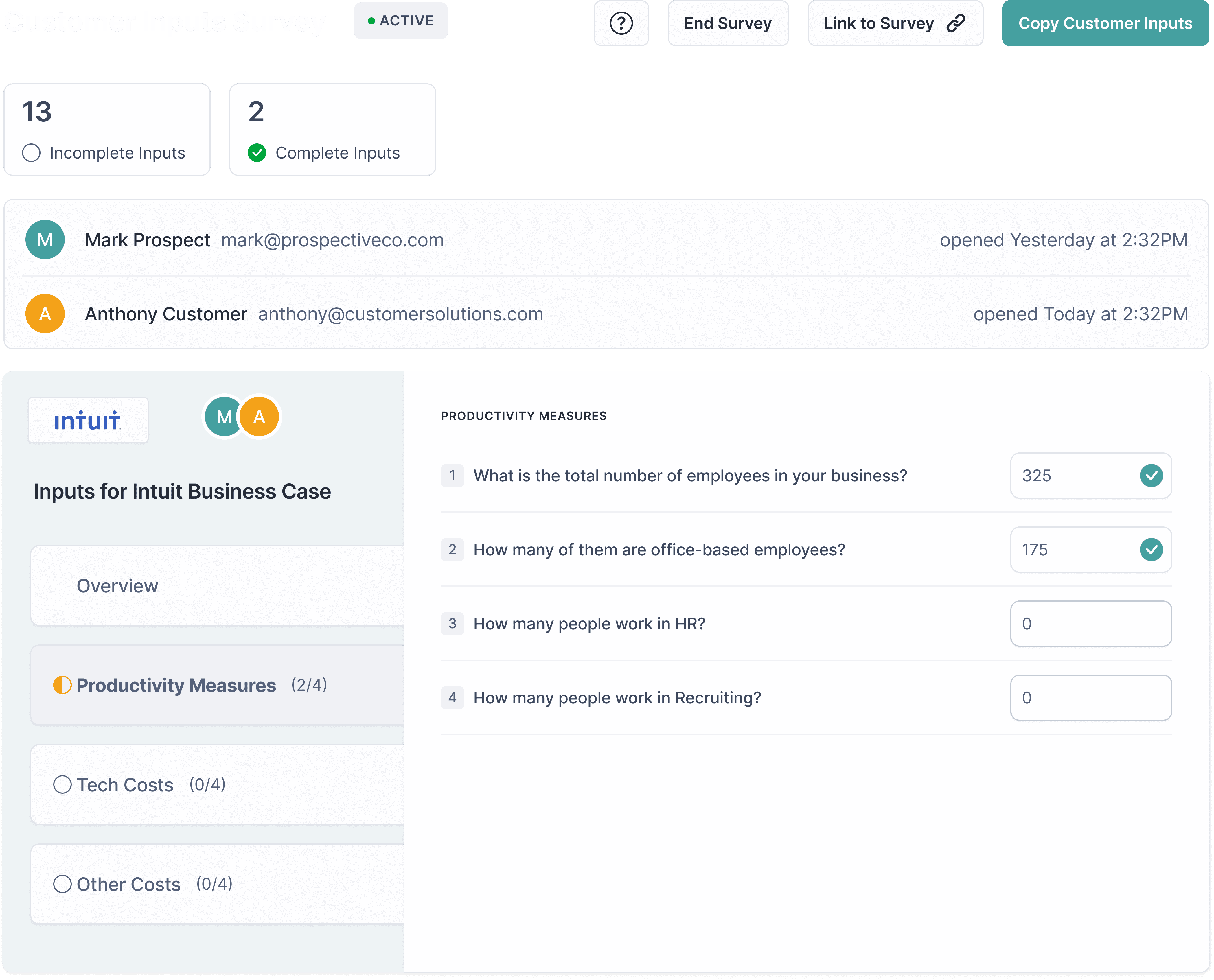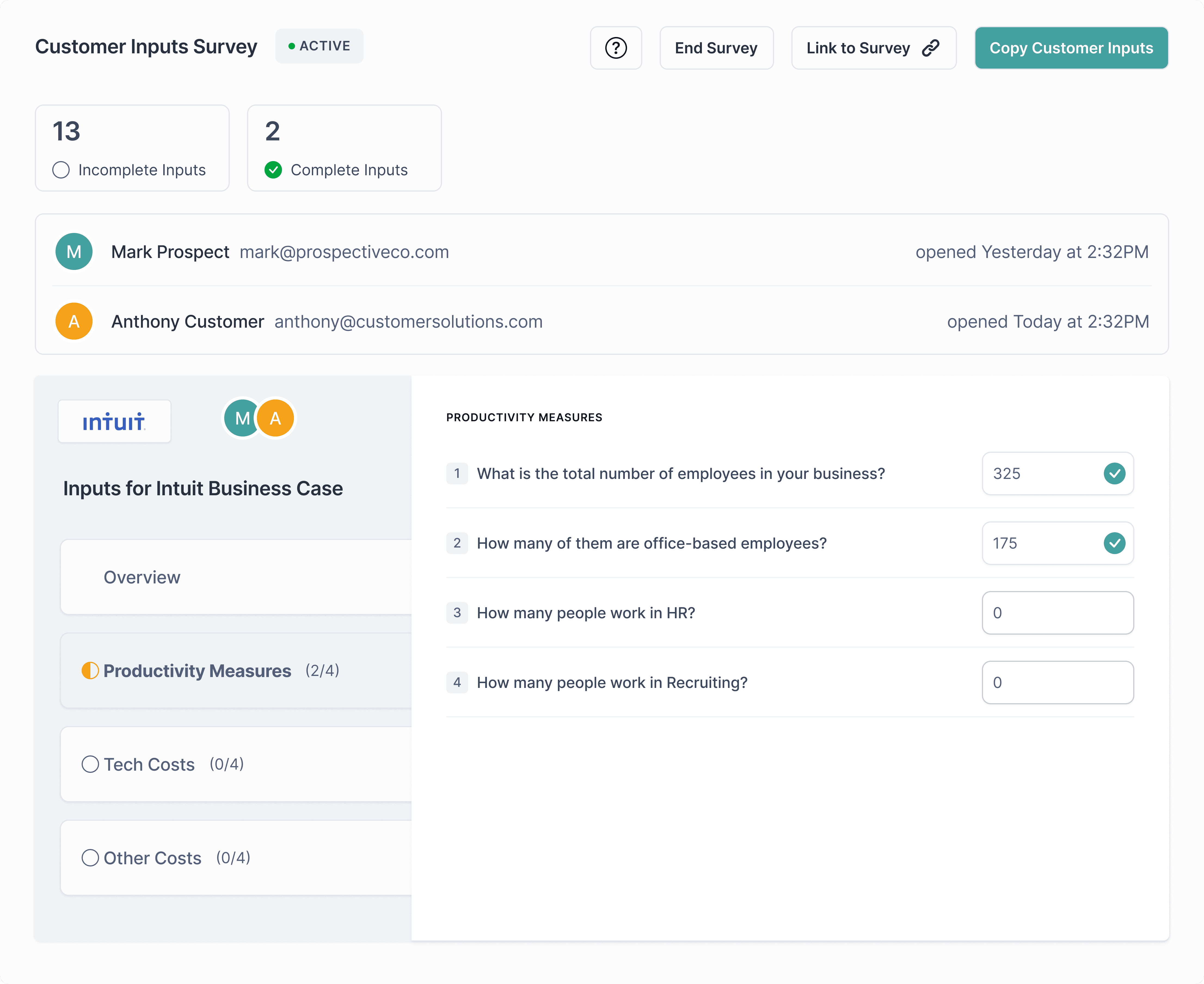 Select and group inputs needed to gather baseline metrics from your prospect. Launch and send a customer-facing survey with confidence.