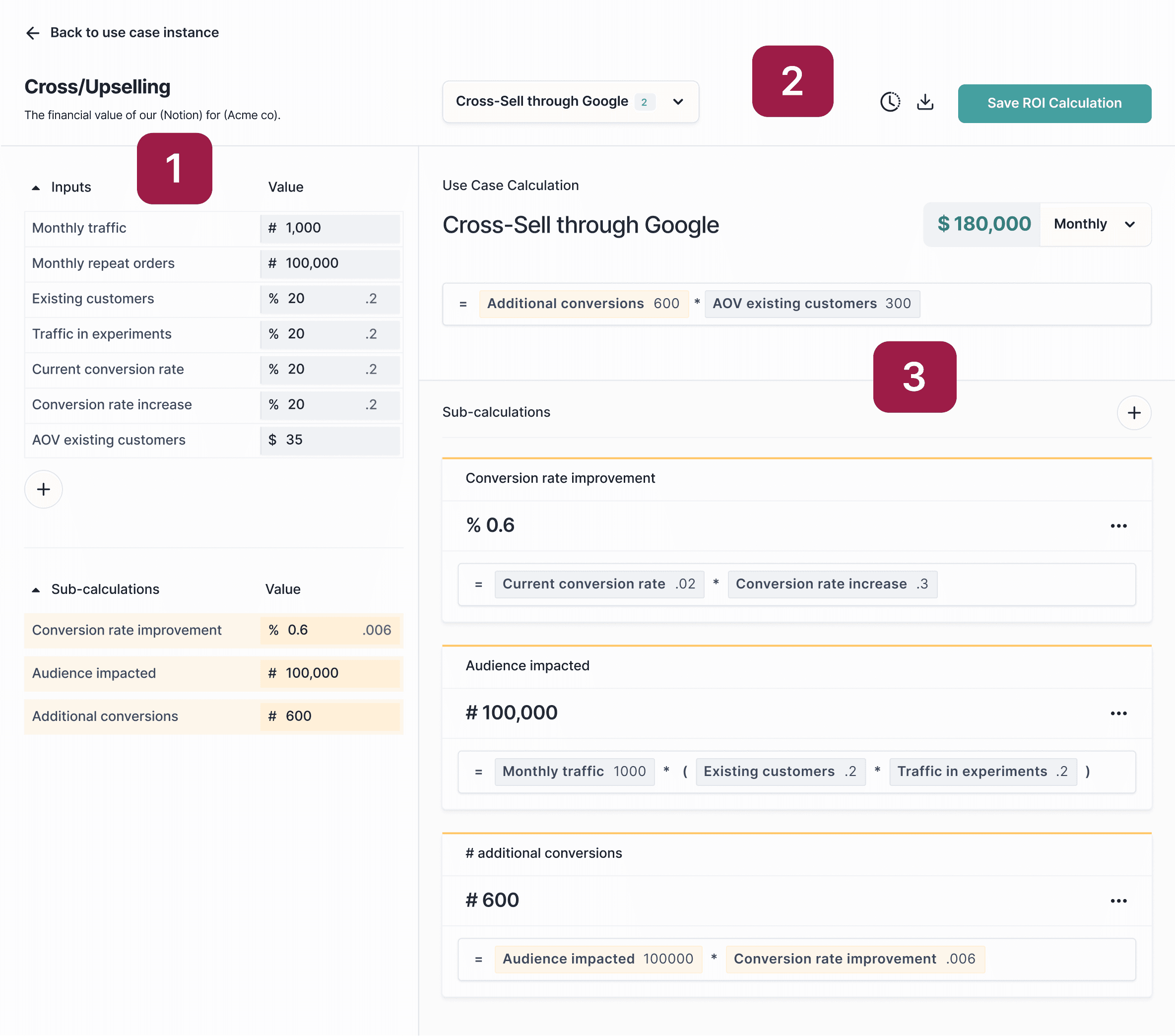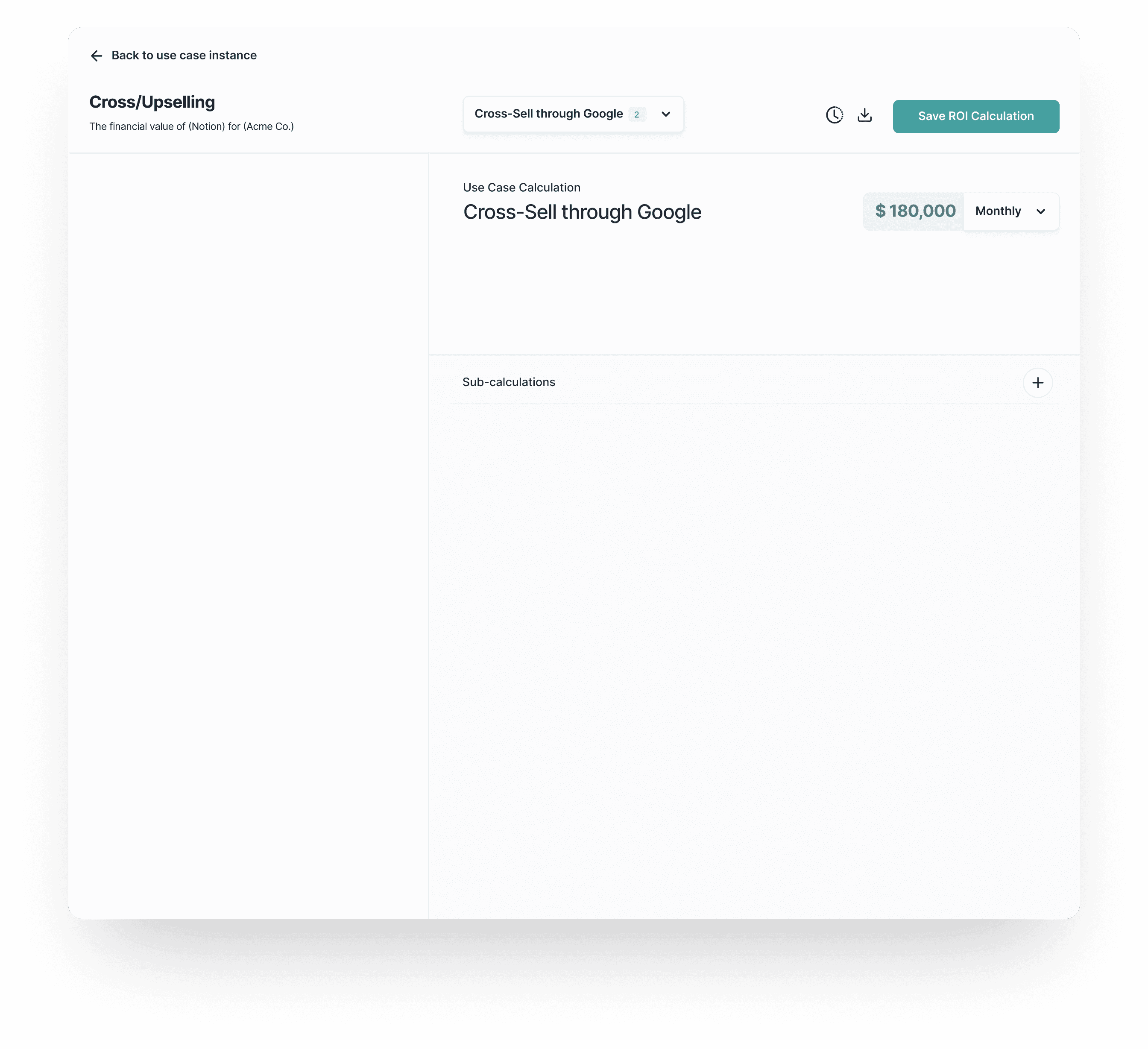 The ROI Calculator helps salespeople make a financial case for what they're selling, using current and projected numbers to illustrate how their product will either reduce costs or improve revenue.
