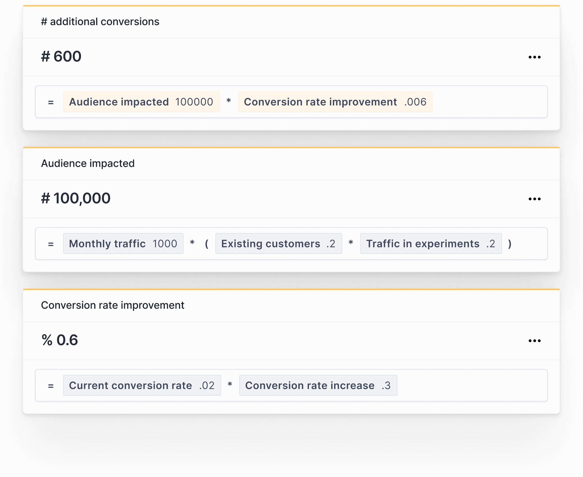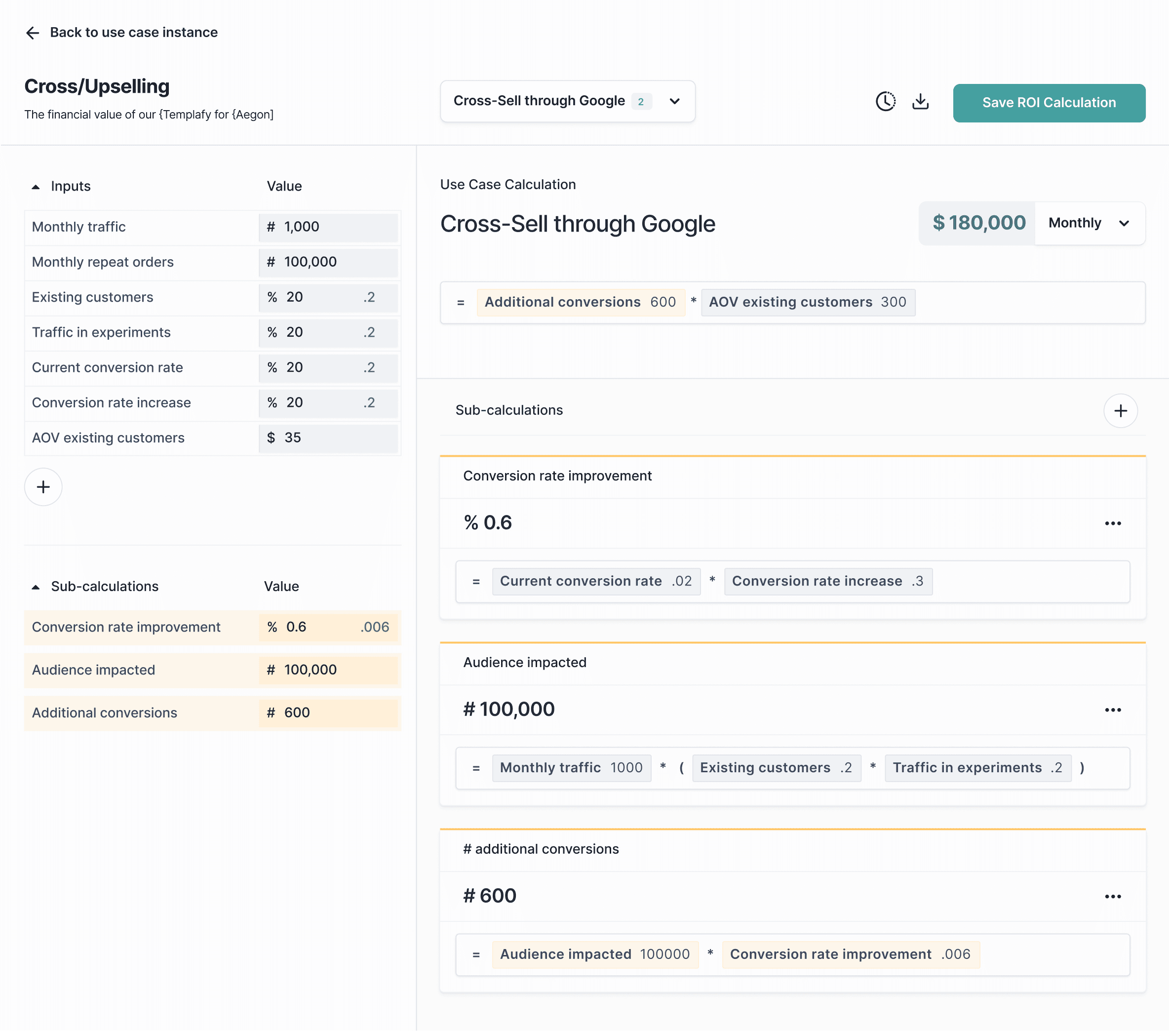 The overarching goal of this sprint was to increase the number of business cases created. In uncovering barriers to users creating business cases, we identified the ROI calculator as a major sticking point. Its block layout was not intuitive for users who are used to representing equations horizontally. Its interface did not support exploration, and overall it was difficult to quickly edit calculations.