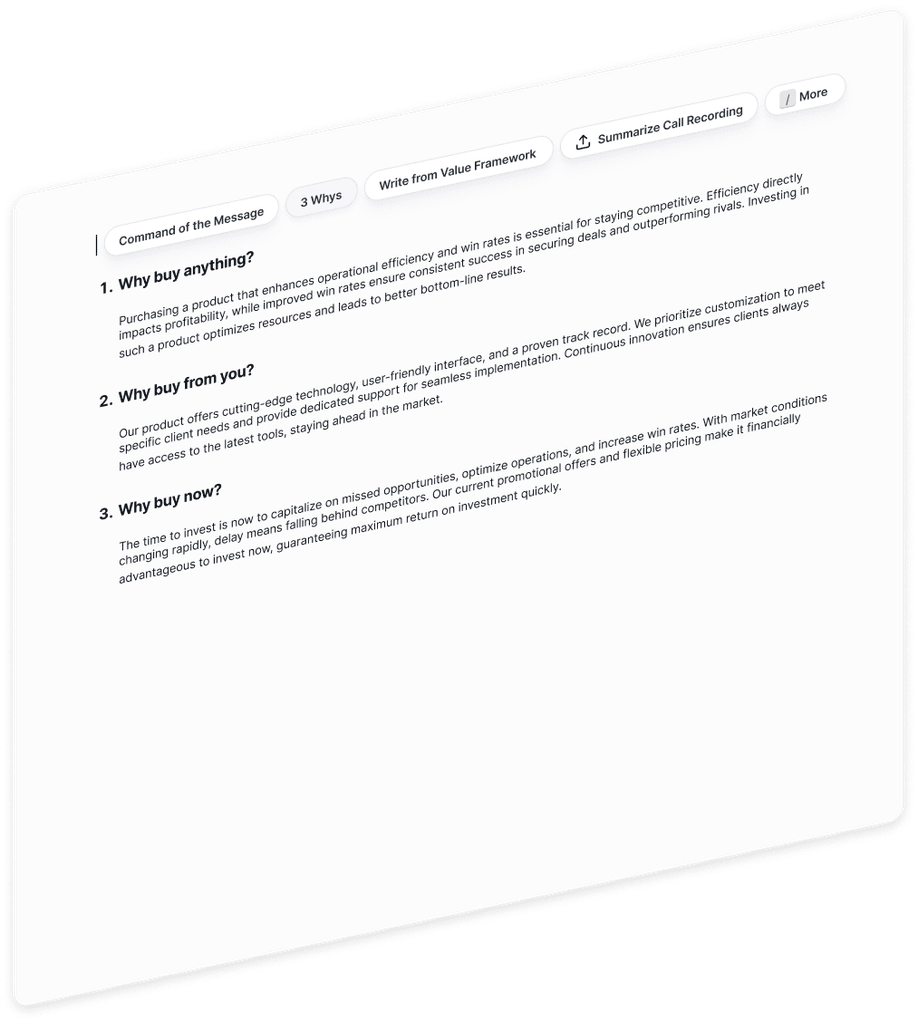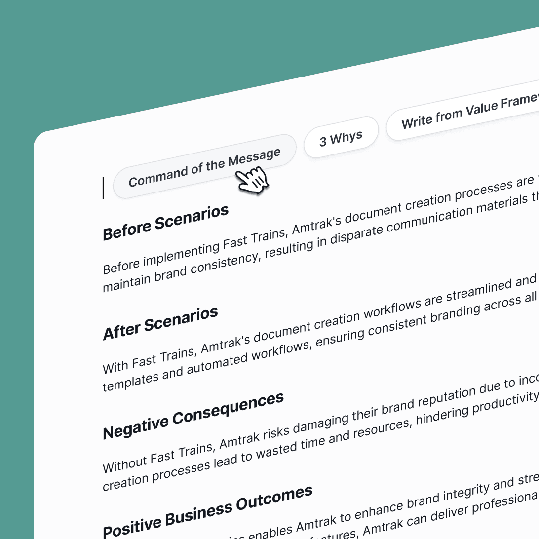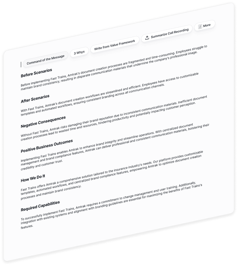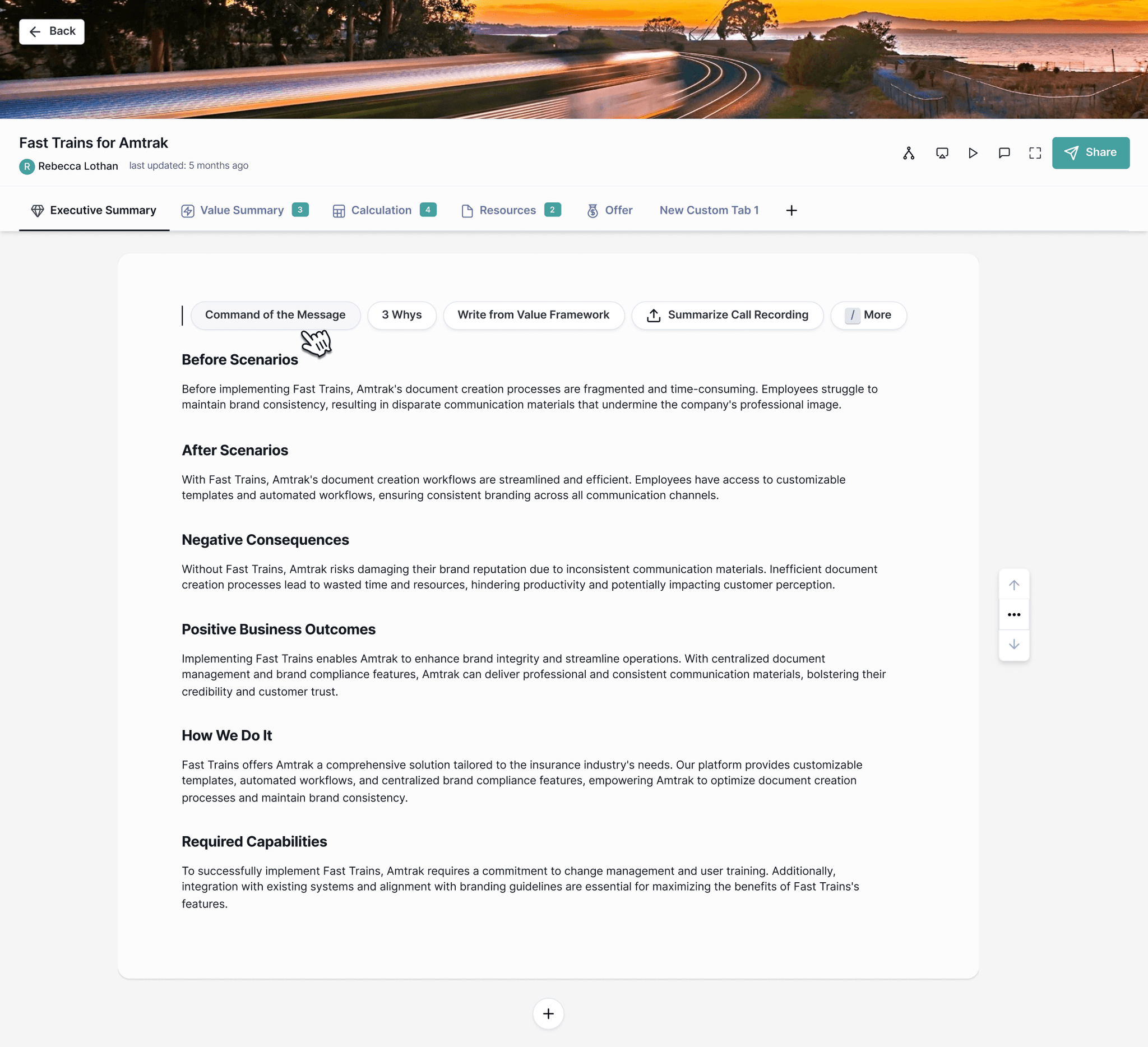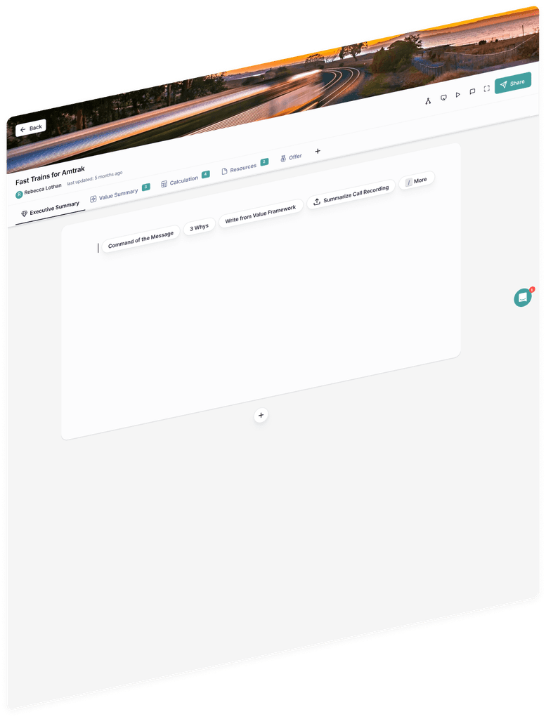 Acting as Lead UX Designer in a 3-week sprint, I designed a tool for salespeople to quickly create a high level overview for Business Cases, or value-based pitch document. The existing AI functionality for Business Cases was not being used, and as a result, very few salespeople were actually writing Executive Summaries. The goal of this sprint was to encourage users to create Executive Summaries, and to help them write them in a clean and focused interface.