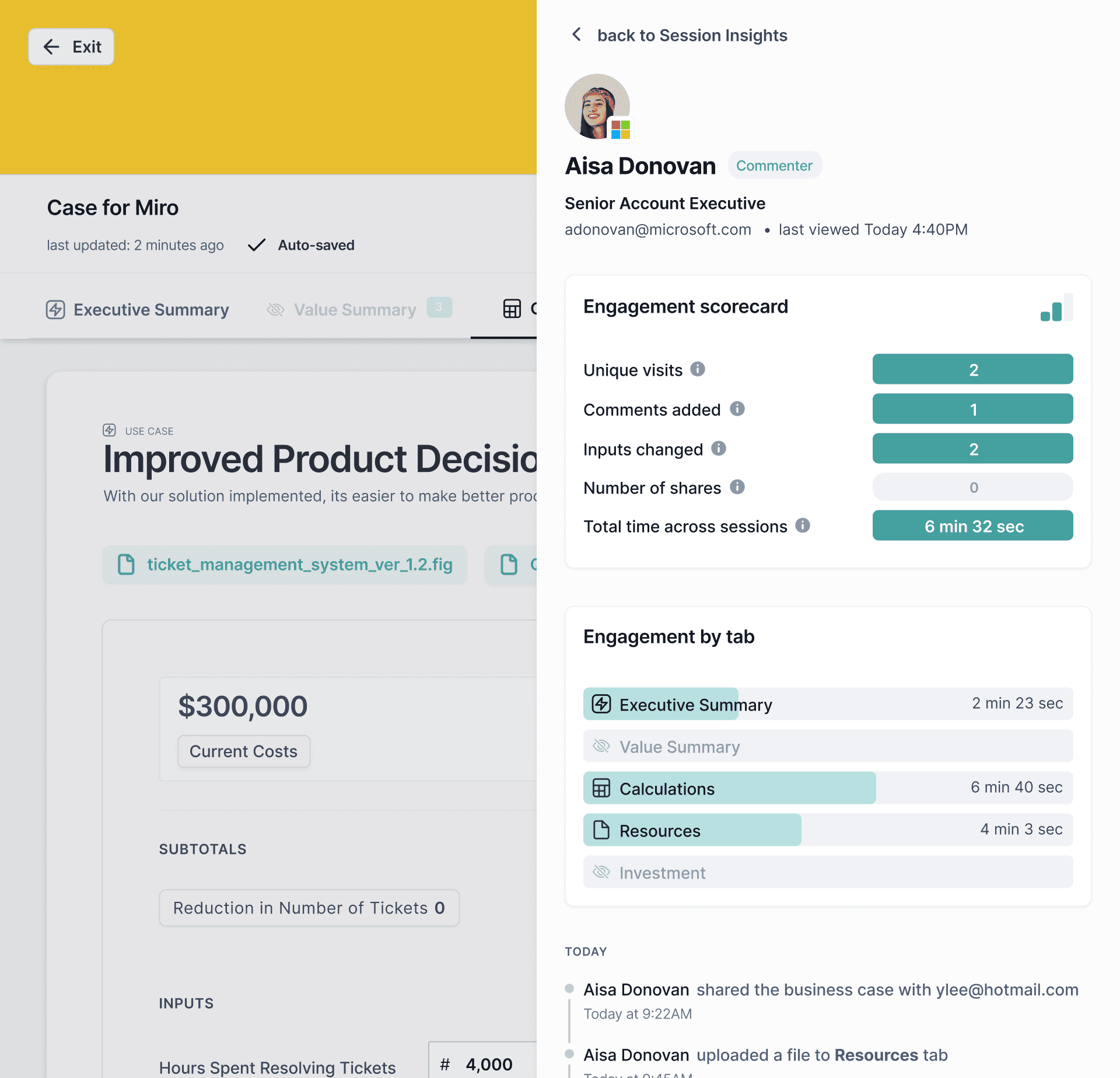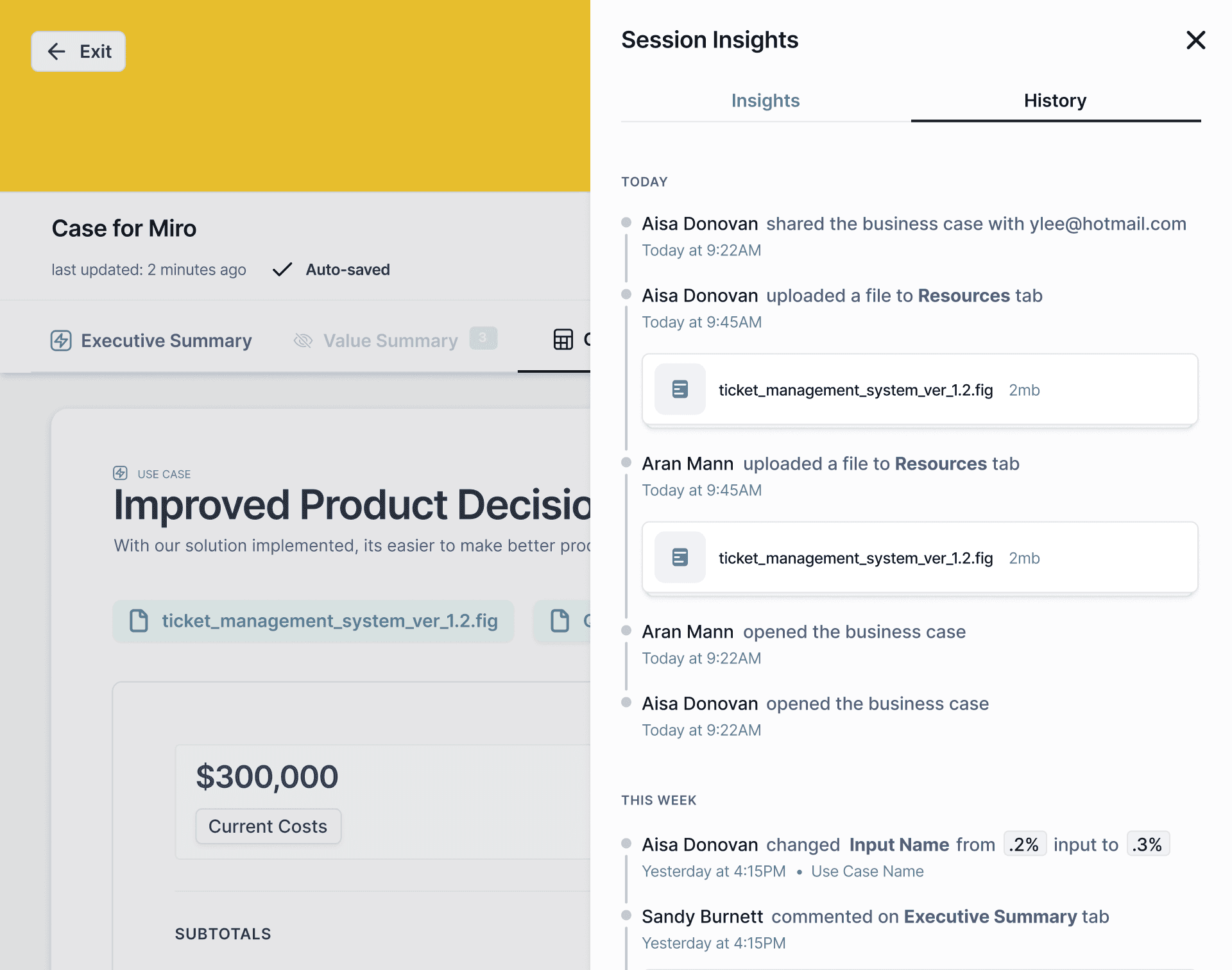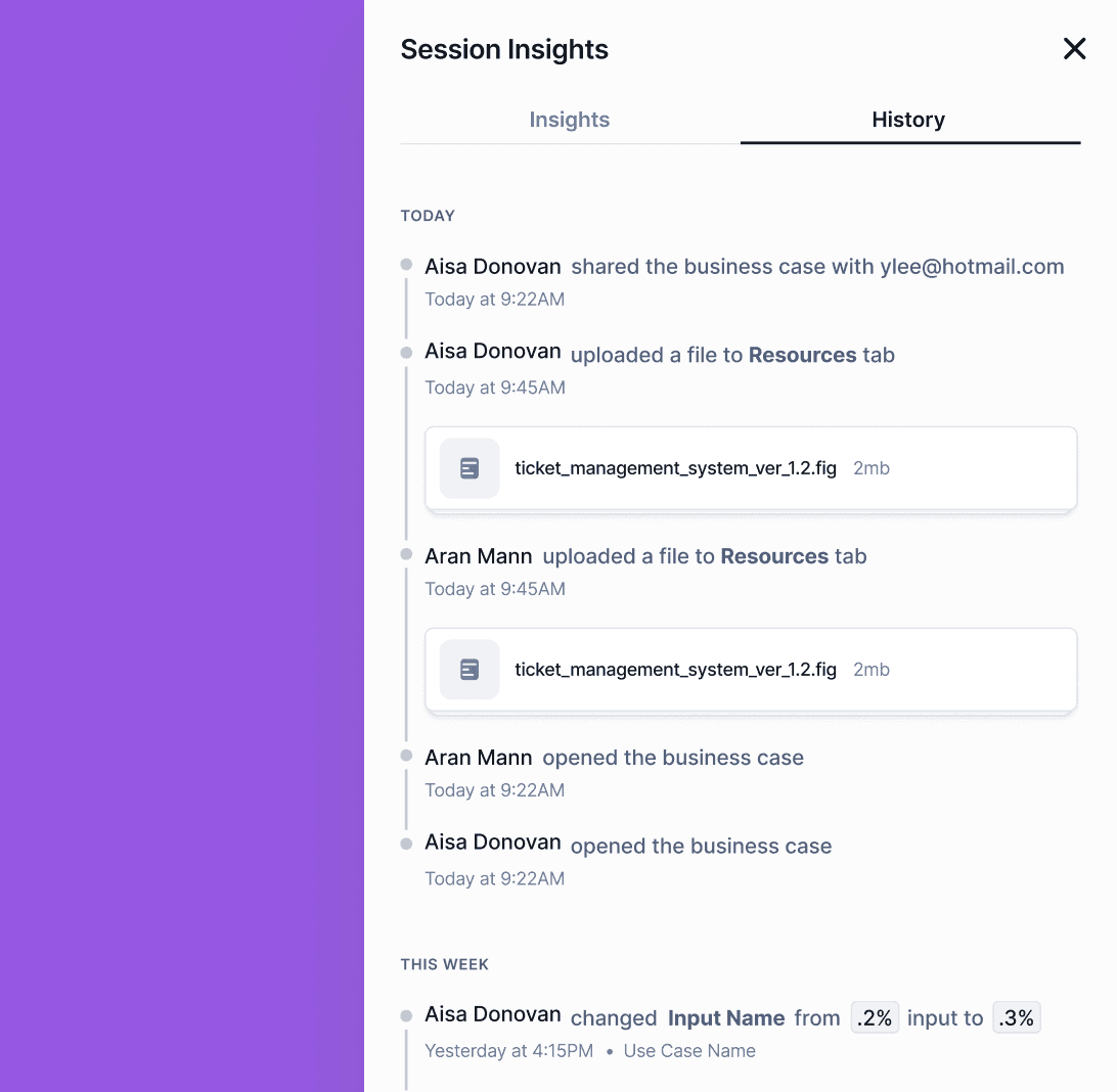Explore user engagement with the new Session Insights tool. The overview tab provides high level insights into user interaction with the business case. Explore detailed logs of all user actions in the history tab. You can also view each user’s specific activities and a simple engagement score by clicking on the name of a user from the overview tab.
