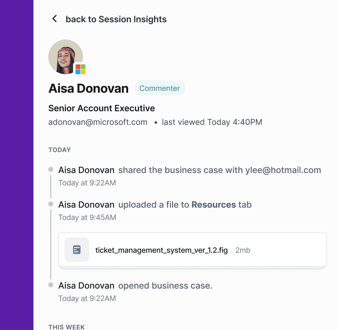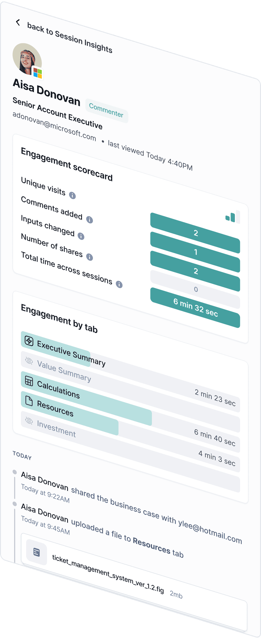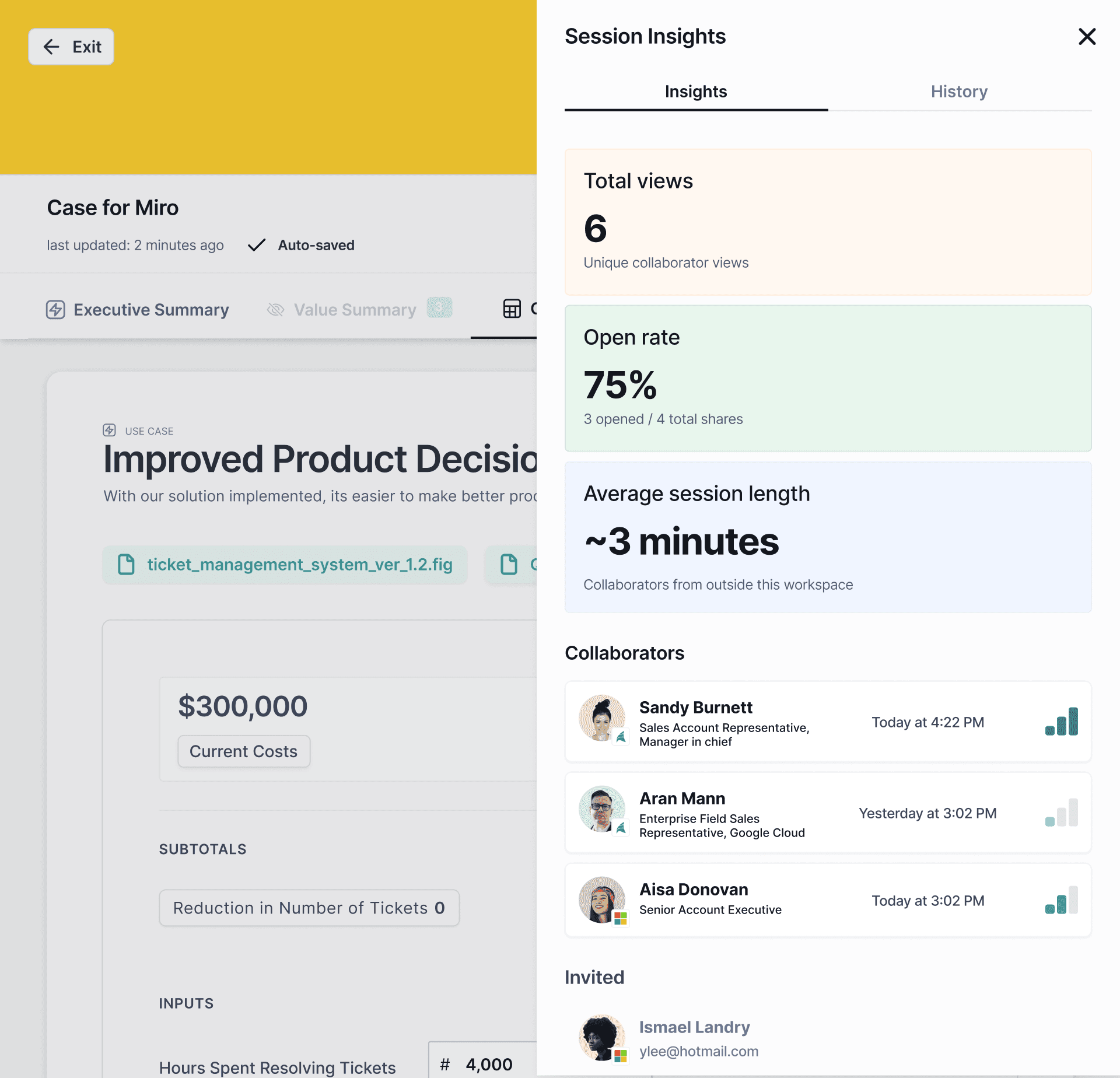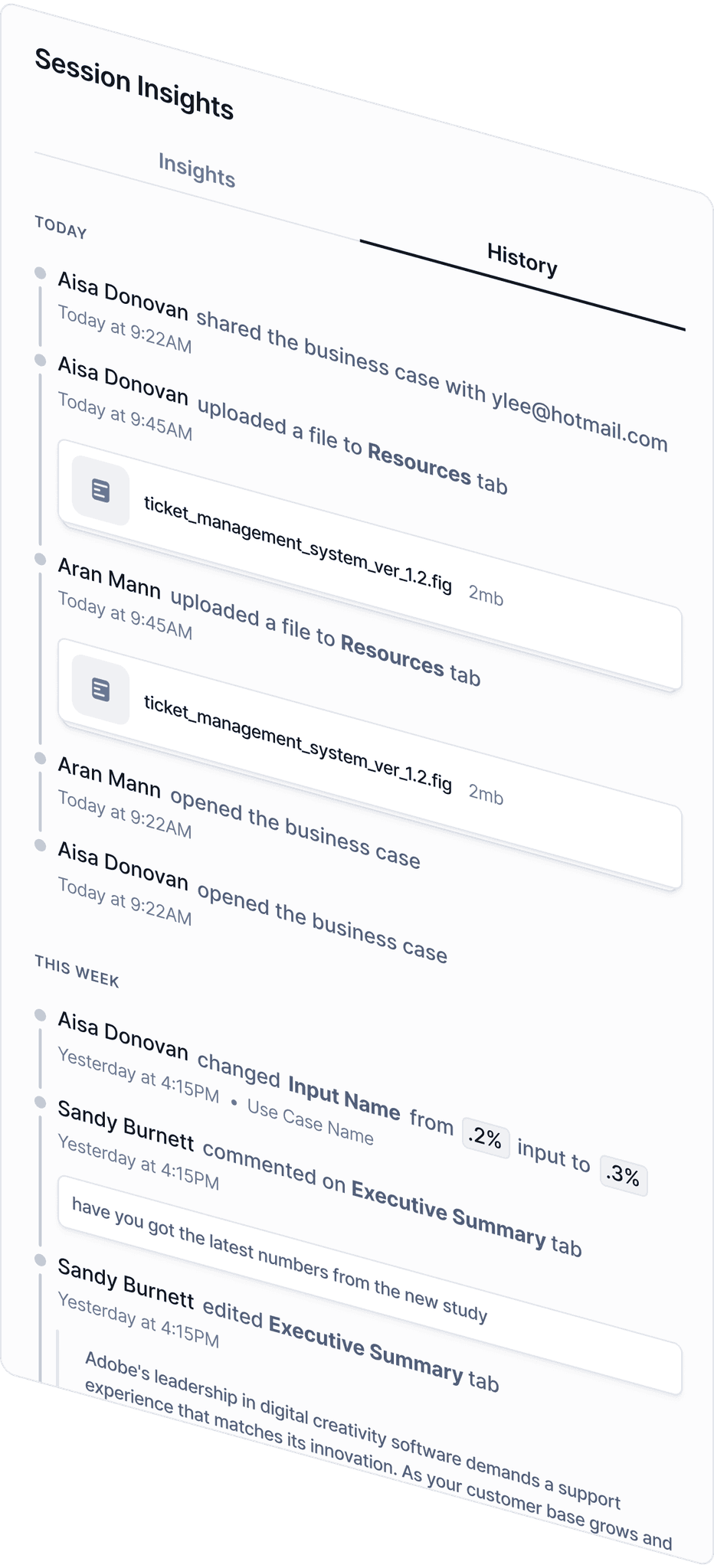 Explore user engagement with the new Session Insights tool. The overview tab provides high level insights into user interaction with the business case. Explore detailed logs of all user actions in the history tab. You can also view each user’s specific activities and a simple engagement score by clicking on the name of a user from the overview tab.
