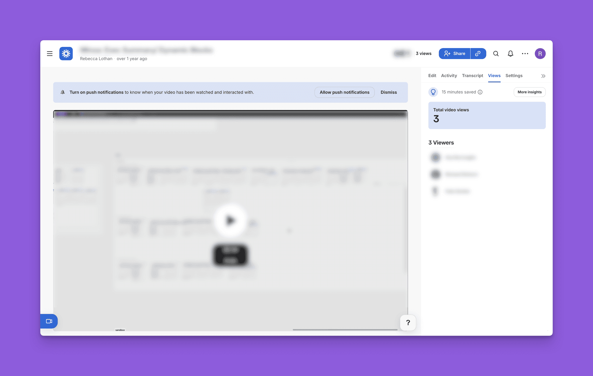 I reviewed a handful of collaborative platforms that surface viewiership insights, looking at what information is called out and how edit history is communicated. Loom and Google Docs were most influential: