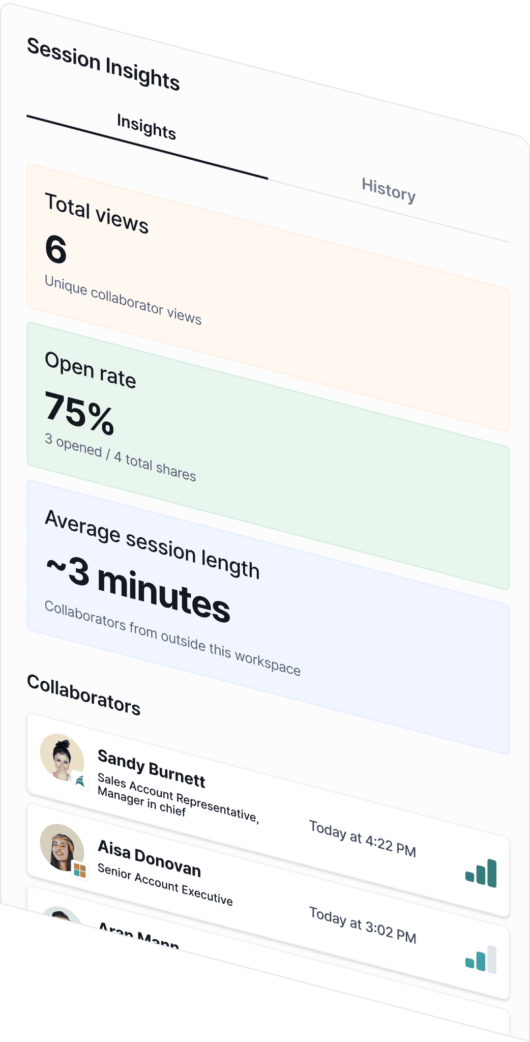 Serving as Design Lead on the Session Insights sprint for Minoa, I designed a feature to expose engagement information and activities occurring within a collaborative document. At a glance, this feature included: