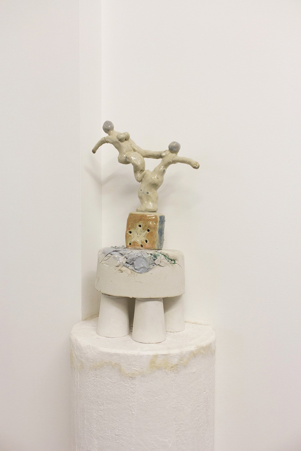 Mimi’s work is self-embodied and stares. Navigating both the rapid obsolescence of new technologies and human mastery over such advances. Damp clay, glass and refurbished mechanic parts in toy-like iteration belong here with us in precarious arrangement, perhaps not always precarious but recently handled and seeking further contact.