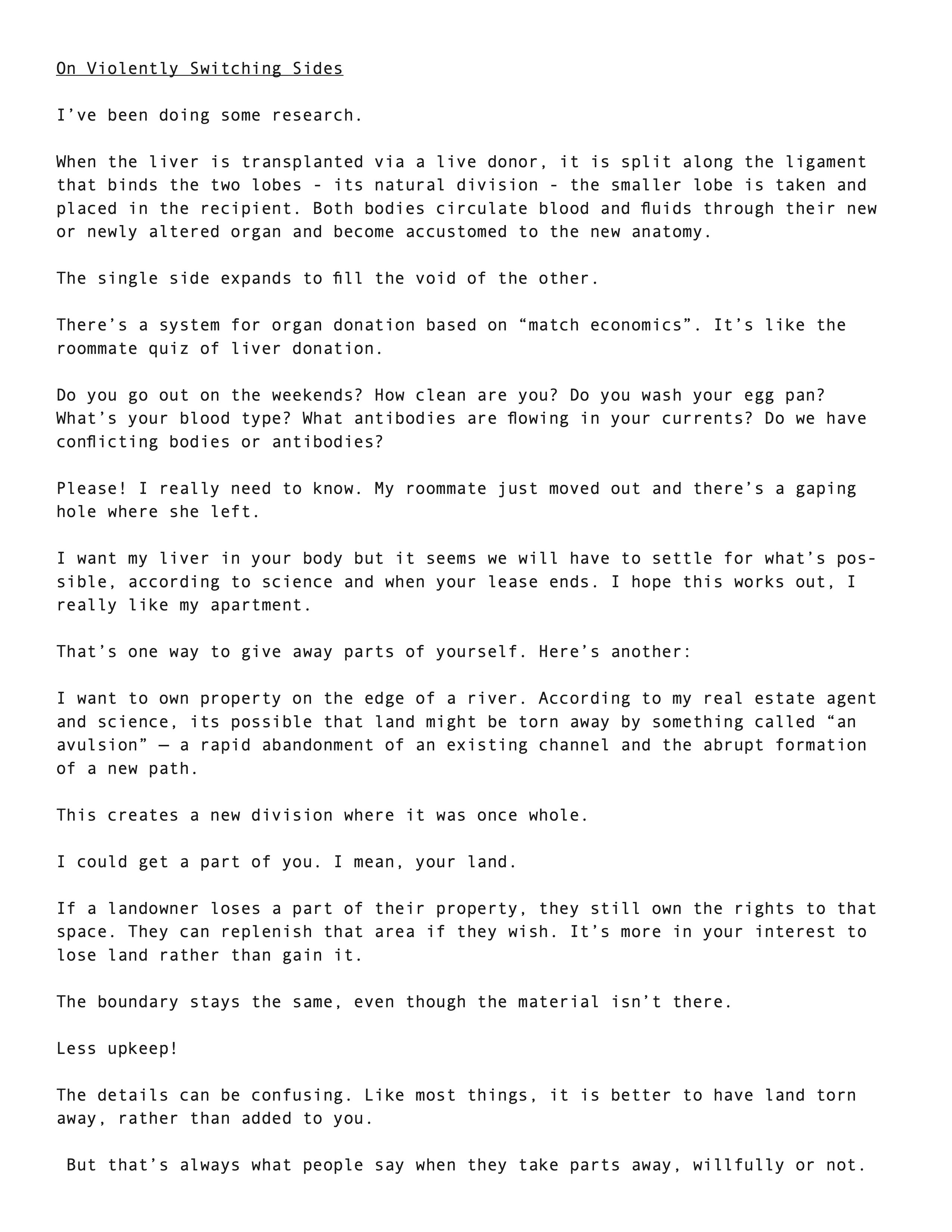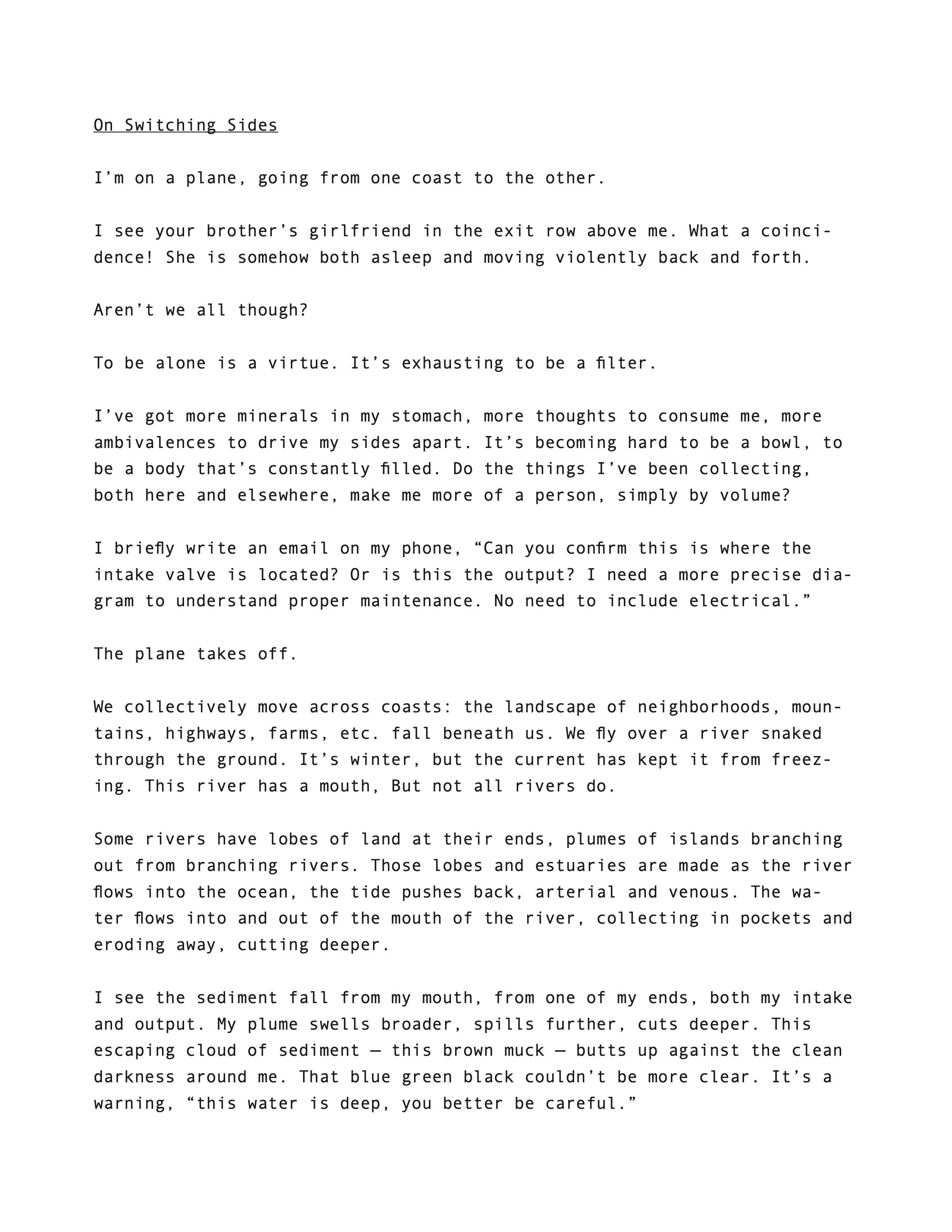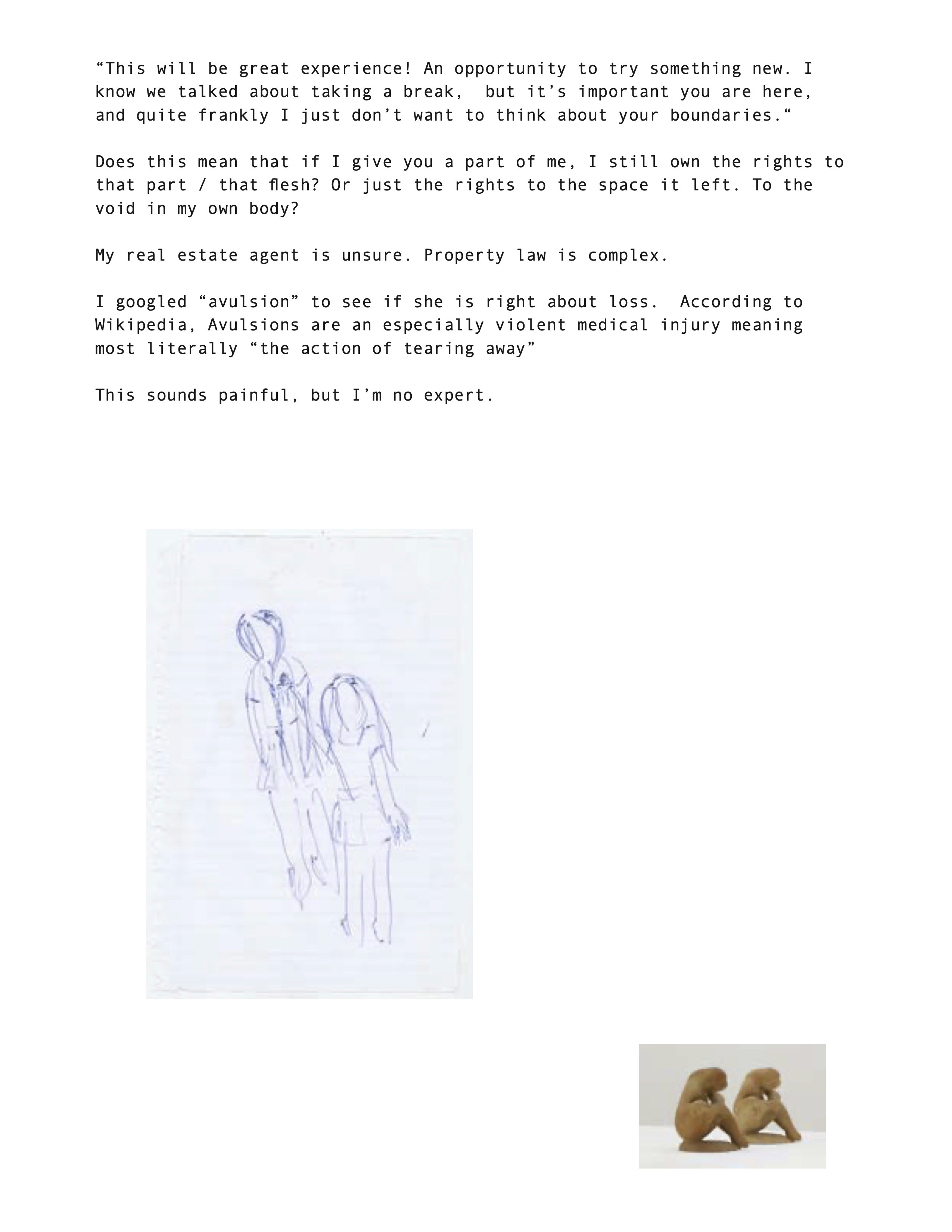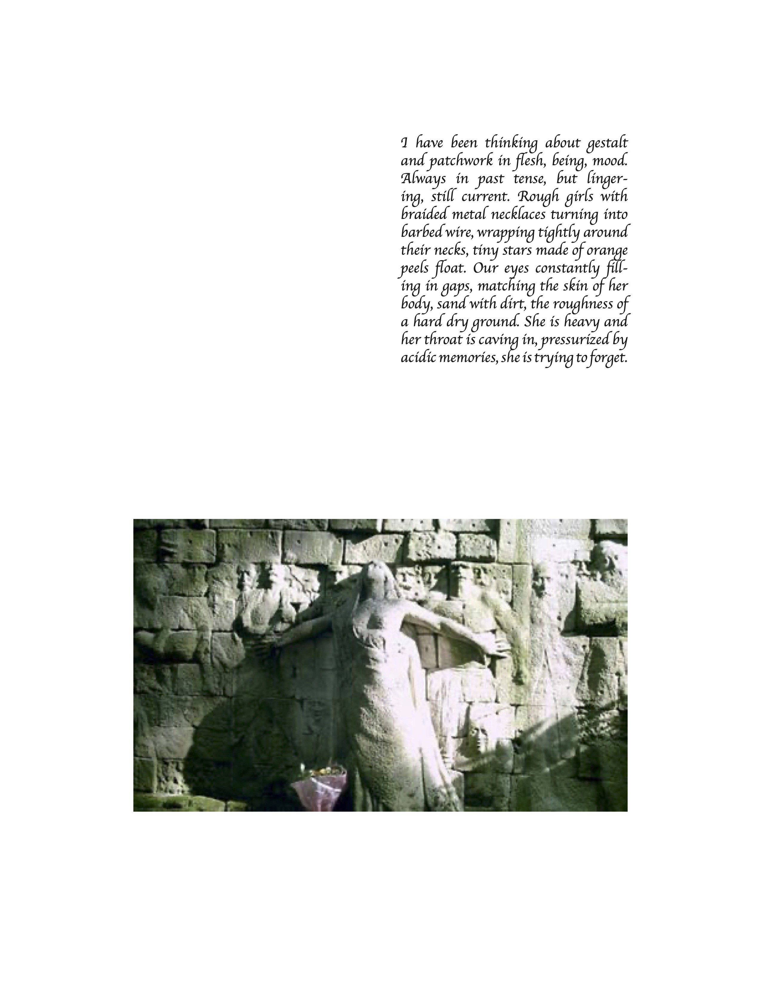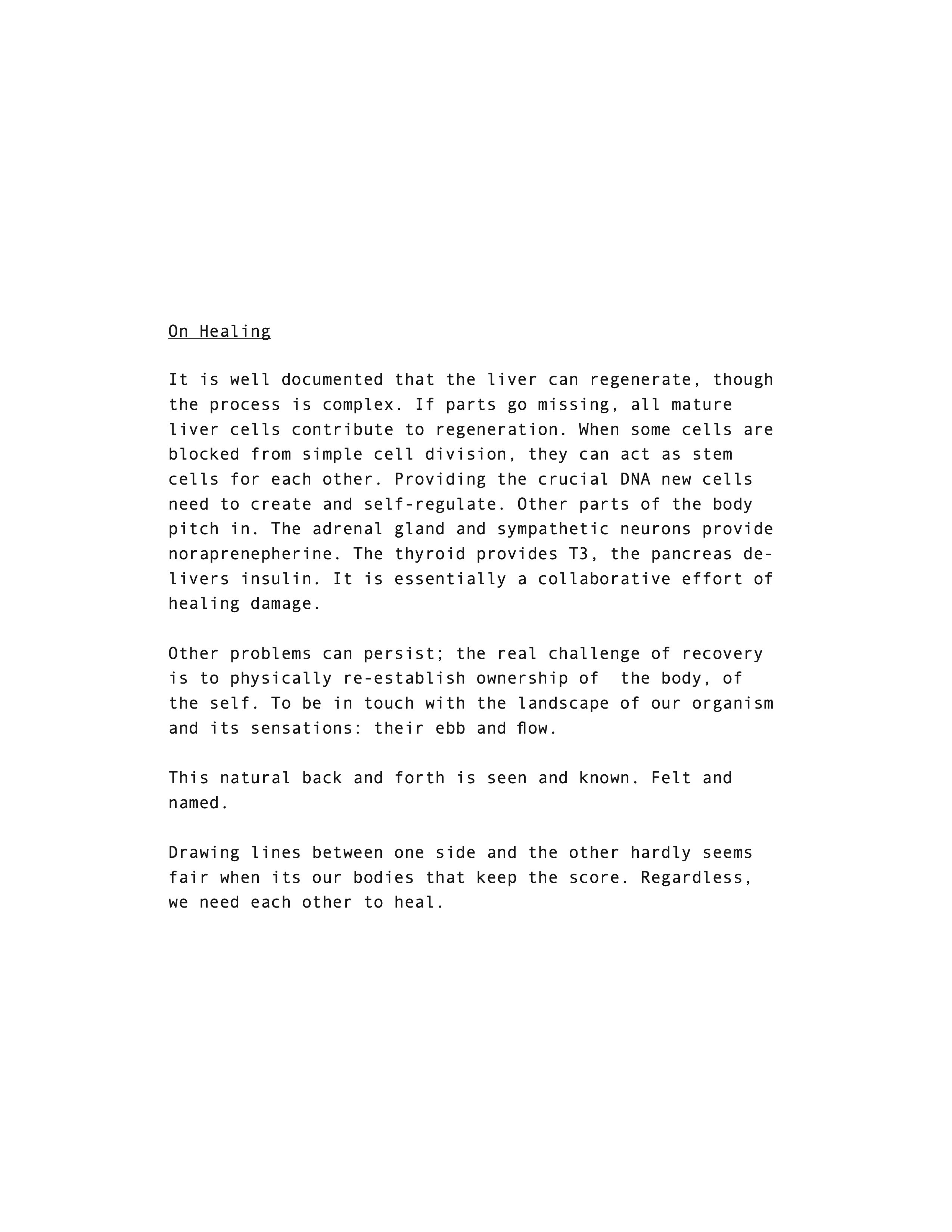 Later– we bury ourselves layer upon layer of land upon fold of skin. Here amidst flesh we take a stance and choose to remain with the immediately tactile for it’s soothing salve for that time when --